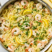 A super easy to make shrimp and pasta recipe! It's flavored with parmesan, lemon, garlic and herbs for a delicious combo that will leave you craving more.